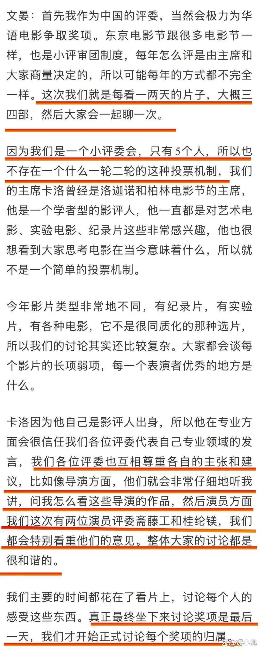 稍微了解一下就知道,东京电影节并不是一上来就把所有评委聚一起选演员评奖,而是先通过一组五个人的小评委会每天观看三四部电影再进行探讨,探讨过程也不是一个简单的流程,而是让每个领域内的评委都发表观点。