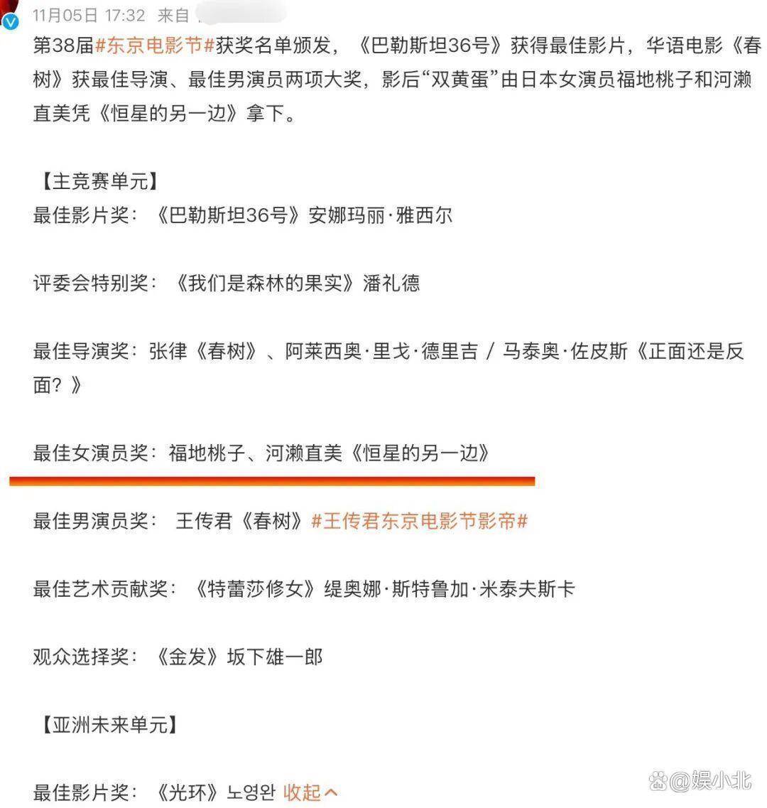 有网友为白百何找补,说东京电影节规定同一部电影的男女主角不能同时获奖,所以王传君走人脉获奖,白百何就没法获奖。