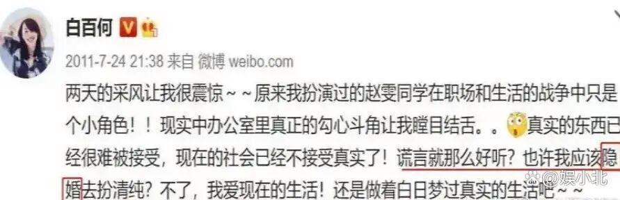 对此,白百何突然发文曝光高露隐婚生子,让年岁本走青春小白花路线还未公开婚育状况的高露,形象崩塌资源流失。